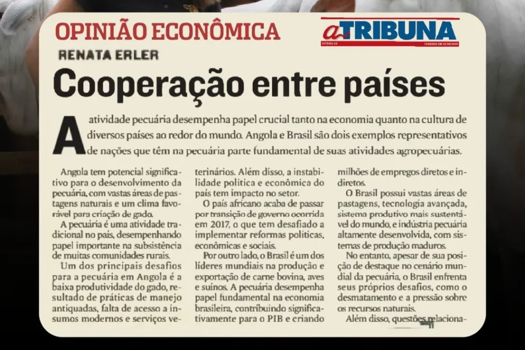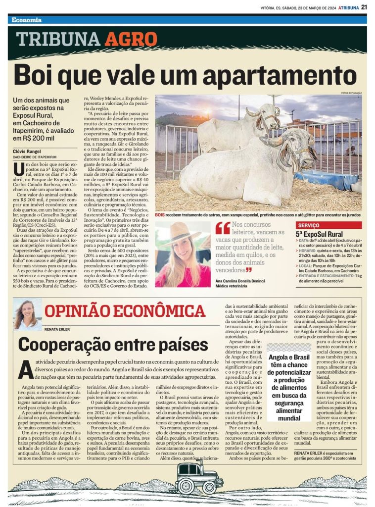 Renata Erler participa da Reportagem no Jornal a Tribuna, no Caderno de Economia, setor Tribuna Agro, sobre “Boi que vale um Apartamento” do dia 23 de Março de 2024.