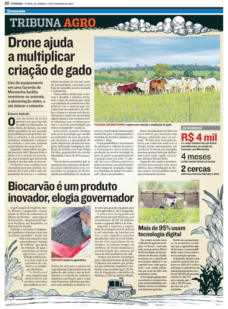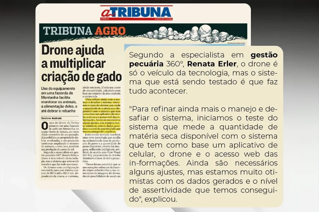 Renata Erler participa da Reportagem no Jornal a Tribuna, no Caderno de Economia, setor Tribuna Agro, sobre como Drones estão ajudando a ampliar os resultados nas fazendas de criação de gado do dia 17 de Fevereiro de 2024.