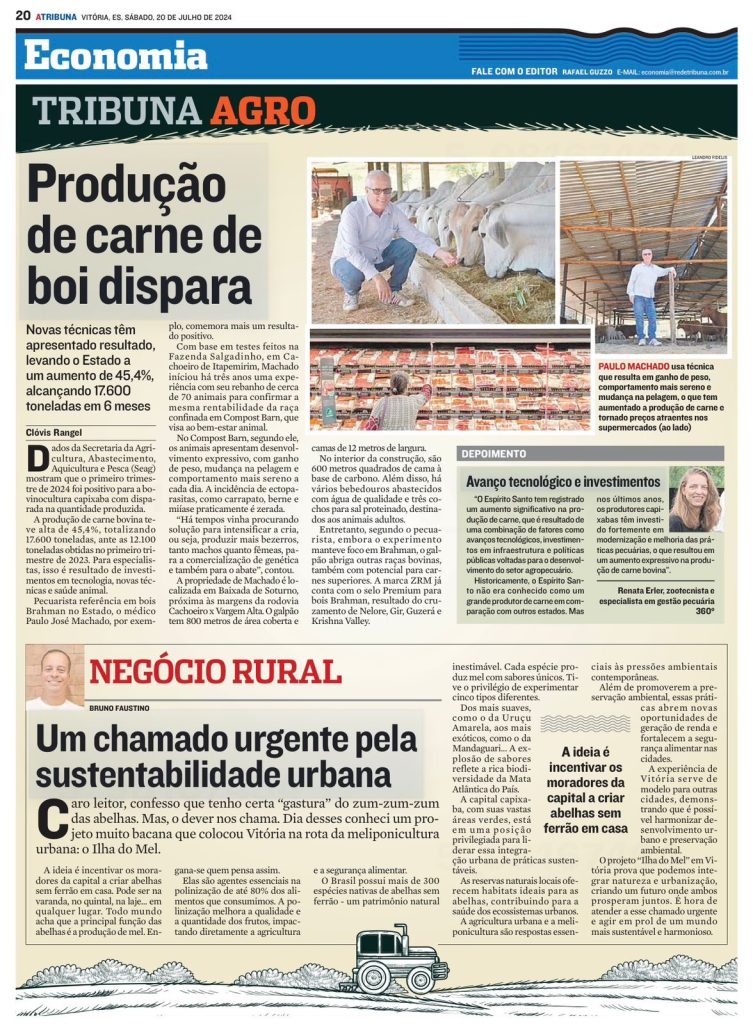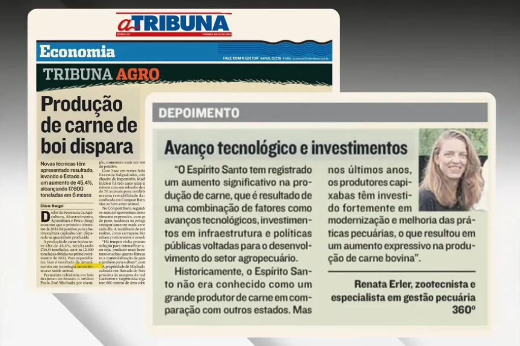 Renata Erler participa da Reportagem no Jornal a Tribuna, no Caderno de Economia, setor Tribuna Agro, sobre “Produção de Carne de Boi Dispara” do dia 20 de Julho de 2024.